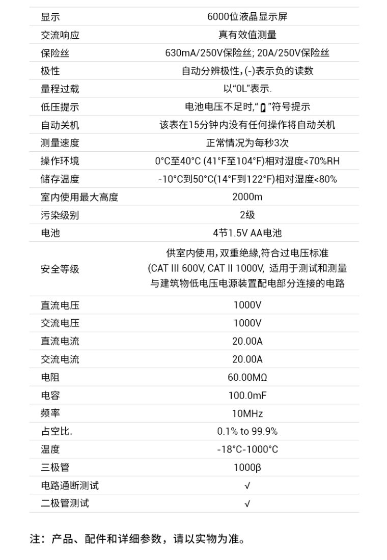 外壳采用双色工艺、手感好、防摔抗震、稳重、安全可靠;设计独特的声光报警功能,在电压、电流、二极管、连续性测试、电容、三极管、NCV、Live功能都有体现;