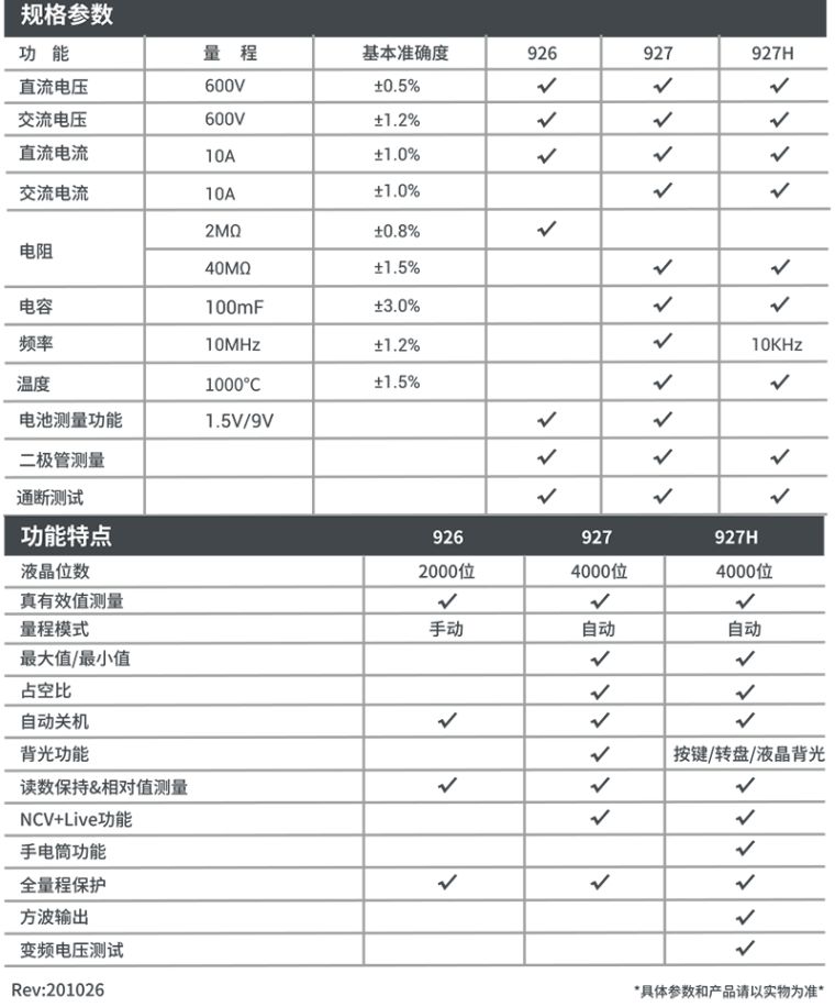 DT-926/927/927H是CEM华盛昌新设计的自动量程真有效值数字万用表,配有LCD 大屏显示。它能测量交直流电压、交直流电流、频率、占空比、电阻、电容、二极管、连续性测试、温度。除此之外,还设计了非接触式交流电压测量NCV,单根表笔火线判别Live、1.5V、9V 电池测量功能。(DT-926无法测交流电流,电容,频率,占空比,温度)