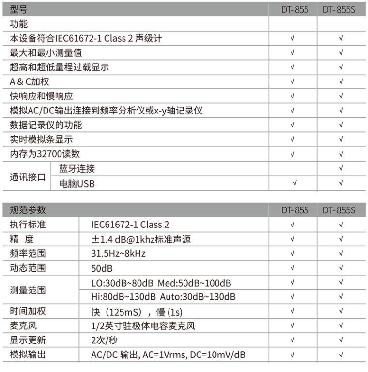 DT-855/855S声级计主要用于噪声工程、质量控制、疾病防治和各种环境噪声测量,适用于测量家居环境、工厂学校、交通干道、机场等环境里的噪音级别。