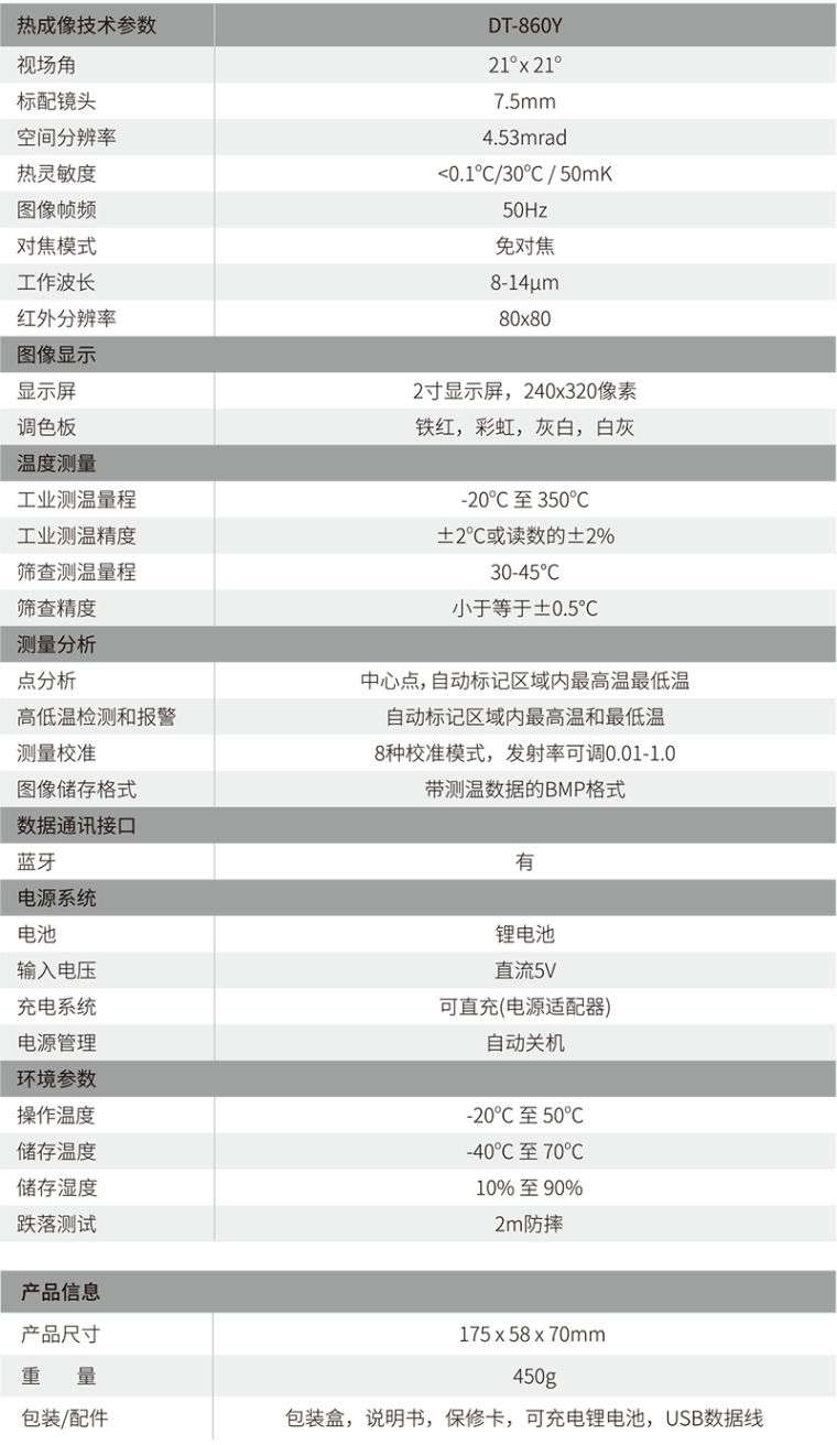 华盛昌DT-860Y,50Hz智能双模式红外热像仪旨在使您的工作更轻松,更高效;50Hz图像帧频用于实时捕获,画面更流畅;温度范围为-20℃至350℃,中心点、热点/冷点标记,自动查找最热和最冷点,可充锂电池和电源适配器供电,蓝牙数据传输实现现场的高效率测温,温感画面成像。
