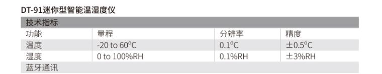 DT-91是CEM华盛昌新设计、研发、生产和推向市场的一款迷你型智能温湿度计,符合人体工程学设计,方便握持和测量,亦可随身携带。此产品涵盖温度和温度的测量,带蓝牙功能,方便随时随地记录和保持数据,适合各类环境测量指标场景的应用领域。