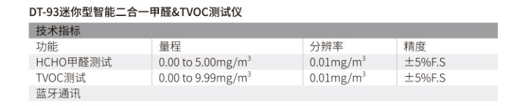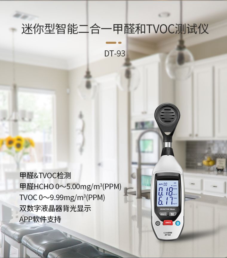 DT-93是CEM华盛昌新设计、研发、生产和推向市场的一款迷你型智能二合一甲醛&TVOC测试仪,产品涵盖甲醛和TVOC的测量,带蓝牙功能,方便随时随地记录和保持数据,适合各类环境测量指标场景的应用领域。