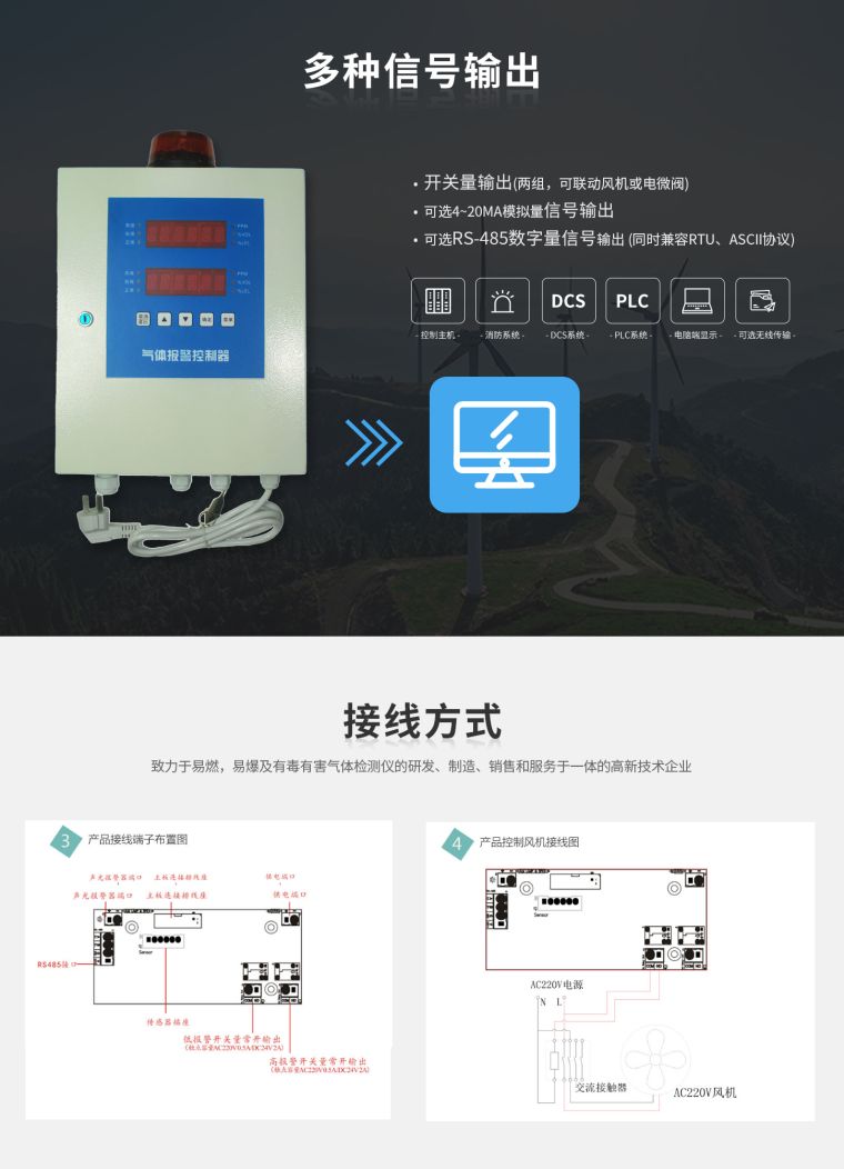 ◆ 两组开关量信号输出,可联动延伸报警器、风机或电磁阀。