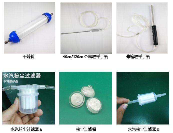 可伸缩采样手柄(1-10米软管,标准长度1米)、0.4米不锈钢采样手柄(带粉尘过滤器,不可伸缩)、高温采样降温过滤手柄、高温高湿预处理系统、湿度粉尘过滤器多个、挂绳、光盘(上位机通讯软件)、SD卡存储、无线数据通讯、外置微型无线蓝牙打印机