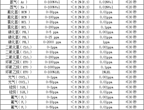 部分可检测气体列表: