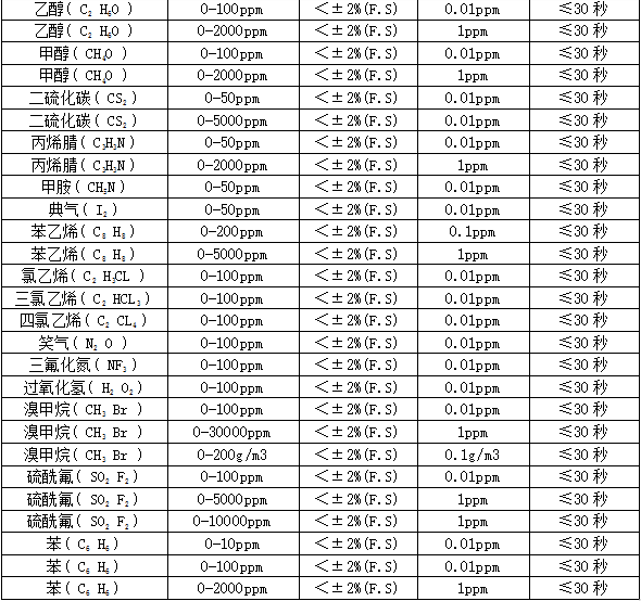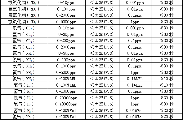 分 辨 率:0.01ppm或0.001ppm(0~10 ppm);0.01ppm(0~100 ppm),0.1ppm(0~1000 ppm),1ppm(0~1000 ppm以上),0.01毫克/升(0~200%毫克/升),0.1%LEL,0.01%,0.001%Vol