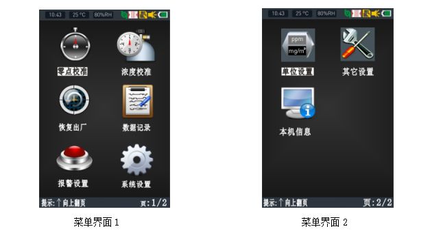 ●3.5寸高清彩屏显示实时浓度、报警、时间、温度、湿度、存储、通信、打印、电量、充电状态等信息,菜单界面采用高清仿真图标显示各个菜单的功能名称