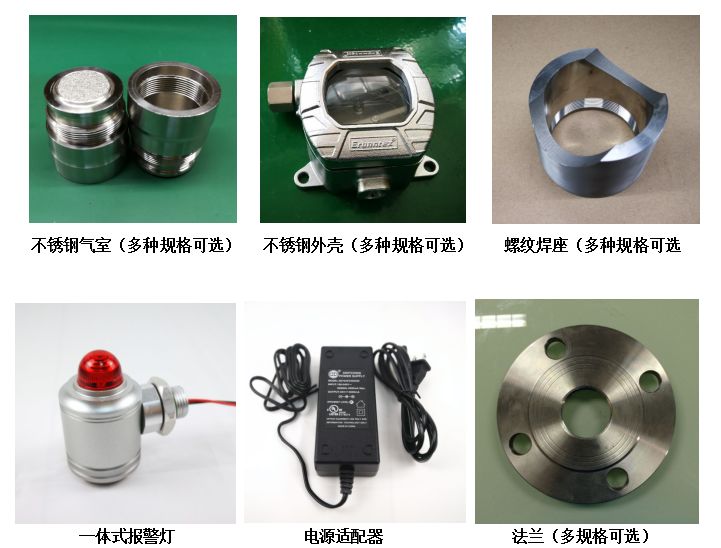 安装型附件:选配:墙壁安装支架、固定在管道上的安装卡扣(四分、六分管)、管道安装不锈钢螺纹焊座或法兰(需注明管道或法兰尺寸,如DN50、DN15...)、防雨罩、24VDC或220AC采样泵(采样距离10米)、真空泵(采样距离40米)、24V开关电源、减压阀、流量计。