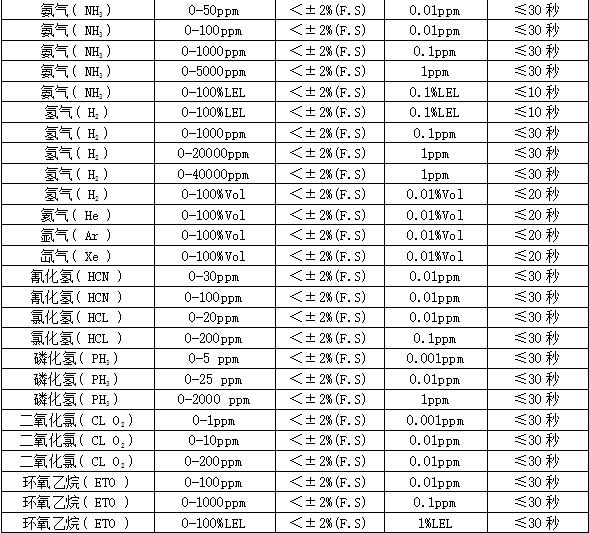 部分可检测气体列表: