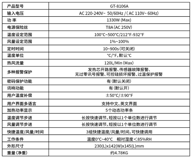 套餐包含GT-8106A主机: 1套, 热风手柄: 1支, 手柄支架: 1个, 风咀:2个,说明书:1本,电源线:1条,