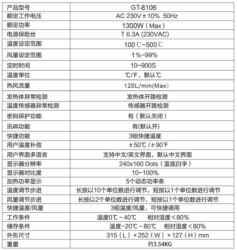套餐包含GT-8106主机: 1套, 热风手柄: 1支, 手柄支架: 1个, 风咀:2个,说明书:1本,电源线:1条,