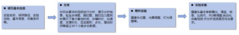 本司开发的老鼠步态分析系统操作简单,在检测时操作流程如图1所示,整个操作流程包括灯光调节、相机等各种参数的设置、视频的采集与检测以及最终结果的图和表的展示。