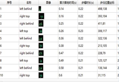 算法自动检测后会对老鼠的步态信息进行计算并将所有的信息输出到软件界面中,计算的数据包括:**着地时间、步幅时常、加速度、支撑时长、足迹面积、步长、摆动时间等数据,所示为部分计算数据。