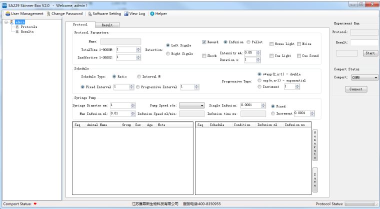 用户可根据实验方案自由选择液体奖励(静脉给药),固体奖励(自动投食)。奖励条件设置,见下文流程设置。液体奖励:可设置单次给药量,范围0.0001ml-5ml,修改相应参数,可适合任意注射器,用户只需设置单次的给药量即可,固体奖励:自动颗粒范围为14mg 或 45mg 互换,无需额外的修改或调整。