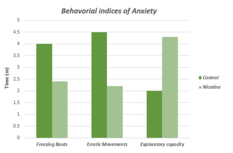 样本数据比较了载体治疗对照组和药物给药(尼古丁)组在时间方面的焦虑行为指数。从图表中可以明显看出,尼古丁导致冻结发作和不稳定运动减少,同时增加了被研究对象的探索能力(运动)。