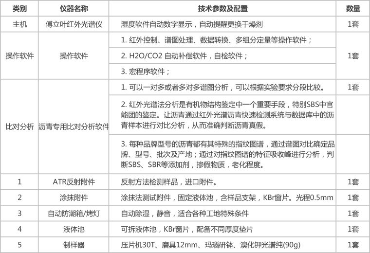 一般来说,沥青的化学组成可分离成饱和分、芳香分、胶质和沥青质四种组分。各组分含量不同,沥青的性质也会不同。使用傅立叶红外光谱仪,通过测试和比对红外光谱,可实现沥青的快速分类。红外光谱法分析是有机物结构鉴定中一个重要手段,特别SBS中官能团的鉴定,让沥青通过红外光谱沥青快速检测系统与数据库中的沥青样本进行对比分析,从而准确判断沥青真假。