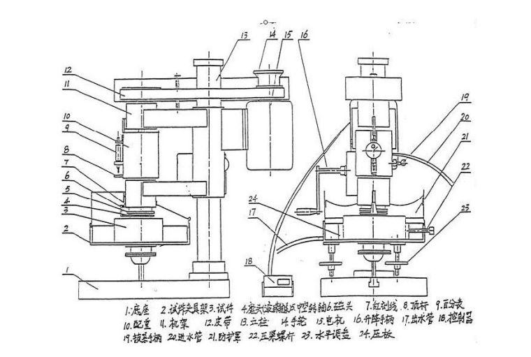 主机由底座(1),立柱(13),机架(11),电机(15),中空转轴(5),磨头(滚珠轴承)(4),试件夹具(2)等组成。电机(15)与机架(11)连接,通过皮带(12)带动中空转轴(5)工作时,中空转轴在垂直方向无约束,中空转轴(5)和配垂(10)辅件的自重全部压在磨头上。