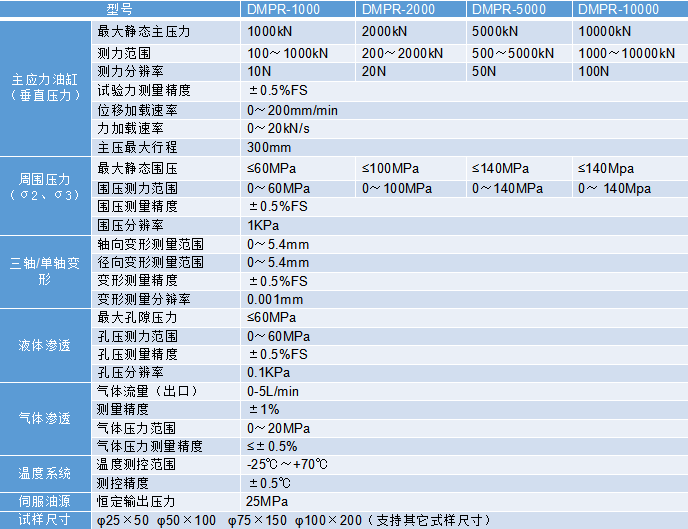 完成各种岩石试件常规单轴、三轴和高低温条件下的单轴、三轴等不同应力路径和应变路径的多种复杂应力条件下的静三轴试验、动态扰动加载试验以及快速卸荷试验,以及在三轴条件下材料的水及气的渗透性试验等。