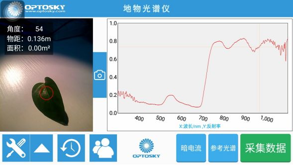 图4 ATP9100F用户界面(截屏),左边图像区域的红色圆圈,为右边反射率谱图的实际测量区域