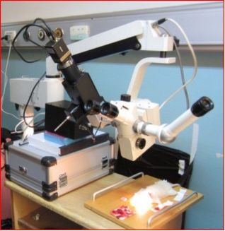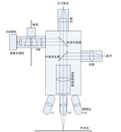 图中所示是医用显微成像光谱仪的原理示意图,手术台上的待测目标经物镜、显微透镜组后分为三路,一路供主刀医生目视观测,一路供助手辅助目视观测,一路由成像光谱仪探测接收,成像光谱仪由电机带动对待测目标进行空间维扫描,得到待测目标的成像光谱信息,再经数据分析图像处理后,通过显示器显示给医生。