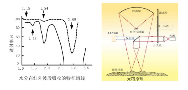 水对一些特定波长的红外光表现出强烈的吸收特性(如下左图),当用这些特定波长的红外光照射物料时,物料中所含的水就会吸收部分红外光的能量,含水越多吸收也越多, 因此可测量反射光的减少量计算物料的水分,基于以上原理GY1000使用应用更为广泛的水的漫反射理论开发。