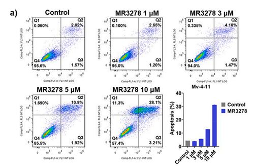 由于MR3278显示出针对AML细胞优越的抗增殖活性,选择该化合物以进一步研究其对细胞凋亡和周期的影响。如图所示,MR3278以剂量依赖性的方式诱导Mv-4-11细胞显著凋亡。随着MR3278浓度从1μM增加到10μM,凋亡细胞的百分比从3.85%变到31.31%。细胞周期分析显示MR3278剂量依赖性地使细胞周期阻滞于G2/M期。