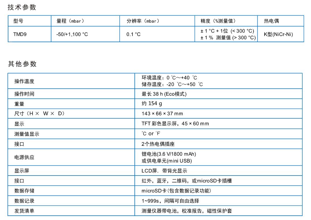 | 应用 | 手持式电子温度计TMD9适用于物体表面,液体,软塑料介质,空气以及其他气体的温度测量和持续的温度记录。 |