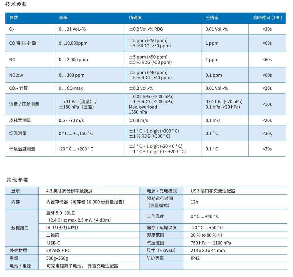 | 特点 | •多功能一体式测量:烟气分析、(差压)压力测量、温度测量、流速/流量测量、密封性等功能。 •采用全新设计,坚固的外壳提供高度保护,仪器机身轻薄,增加使用舒适感。 •高清彩色显示大屏,菜单导航一目了然,操作直观,防刮钢化玻璃提供坚固保护。 •仪器背部使用强力固定磁铁,机身一体式设计,可轻松实现免提工作。 • “双模式操作”先进概念:通过滚轮和大触屏操作,更大显示屏 4.3英寸,单手操作便利,支持戴手套操作模式。 •自动计算参数:CO2,NOx,CO(未稀释),温差,燃烧效率,过量空气系数,烟气损失值,烟气,露点。 •多功能存储器:一份报告最多可包含六项测量结果(部分负载/全负载测量值/平均值或烟气测量值和气体压力测量值)。多种测量结果(烟气、压力、流速)的测量结果可保存在同一个文件中或打印在同一报告上,最多可储存 6种应用测量值。 •可与CAPBs®测量仪结合使用,为仪器扩展超过 35项测量参数,覆盖绝大部分暖通测量需求。 •标配长寿命O2传感器,质保时间更长。 •支持EuroSoft® connect应用程序,可通过蓝牙或二维码传输数据,进行现场记录。 •锂电池容量5,000 mAh,大大提升了续航时间,可持续运行12小时。新型USB-C数据接口和快速充电功能。 |