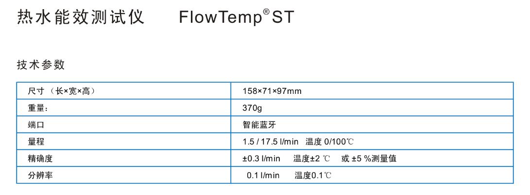 热水能效测试仪FlowTempST可同时测量水的流速(l/min)与温度(℃),对于流速测量,它有一个超高精度的传感器,而对于温度测量,它有一个PT100的传感器。这两个传感器都装在高强度的塑料外壳中,此外壳保护等级达到了IP67。紧凑型的设计致使FlowTemp ST可以在低潮的场合使用。另外,本产品通过了TüV认证(S121700/15)。可通过智能蓝牙与AFRISO蓝牙仪器、智能手机或者平板电脑进行无线连接,进行数据的查看与处理。
