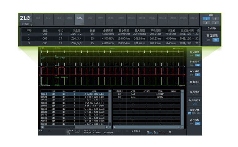 ZDL5000示波记录仪配合CAN接口模块可以实现对CAN信号的同步测试,通过加载DBC文件可以对新能源汽车的CAN信号进行数字转化,从而达到对CAN报文统计分析的能力。