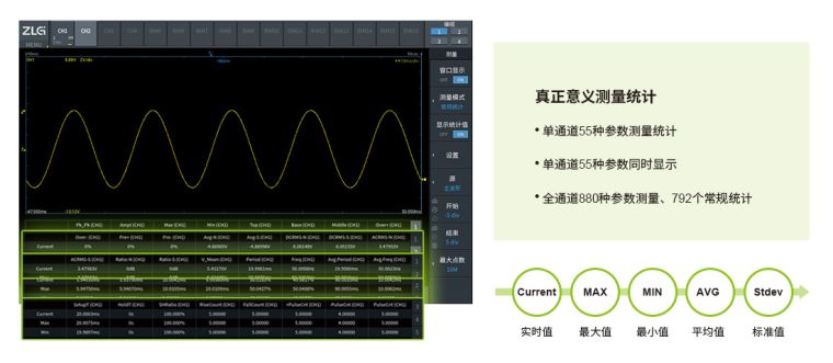 如果工程师用惯了示波器的参数测量统计功能,不用担心,它被完全移植进入ZDL5000,共55种参数测量统计可以满足绝大多数工程师的使用要求。