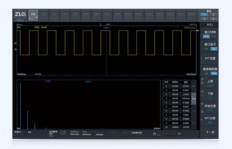 ZDL3000最高可通过100K点的FFT对信号进行频谱分析,此功能不仅可以完成对频域的定量分析,还支持频谱查看和数值的实时查看与存储。进一步还能使用光标对峰值进行自动捕捉。