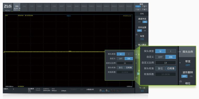 在测量大电压和大电流时,ZDL3000往往需要配备高压差分探头和电流探头,有时传感器的出厂放大比例和实际会有差别,为了提升整体测试精度,ZDL3000加入了探头比例校准和延时修正功能,确保系统整体测量精度。