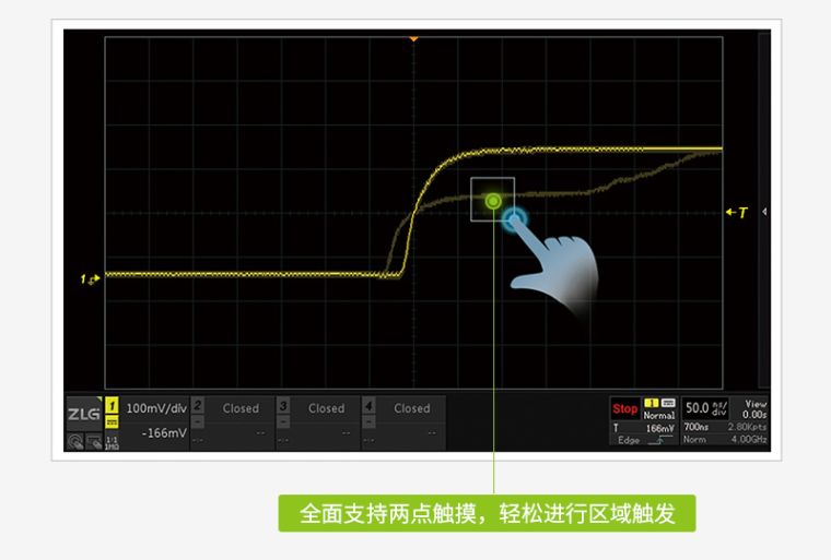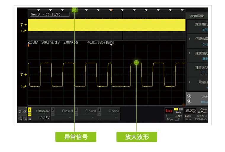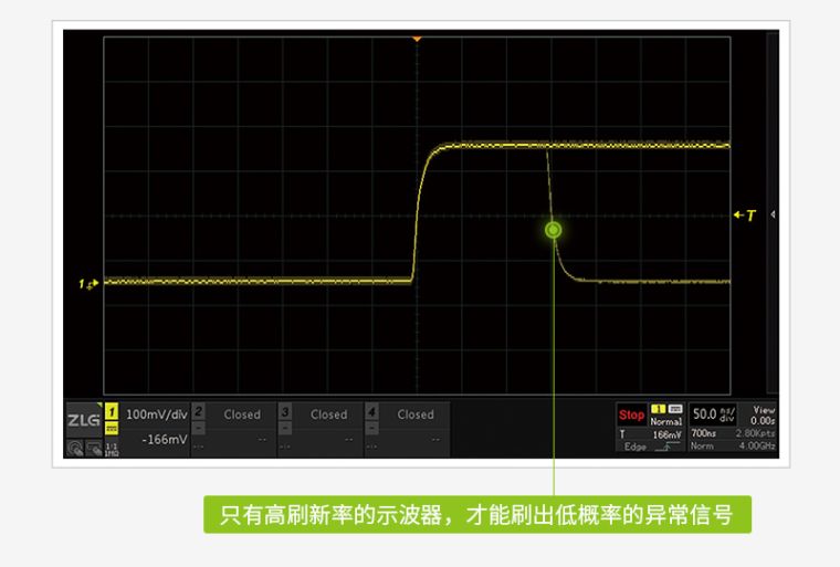 示波器波形刷新率越高,死区时间就越短,可以更快发现偶发性的异常信号。ZDS5054Pro示波器突破100万次/秒波形刷新率,让工程师快速发现异常信号。