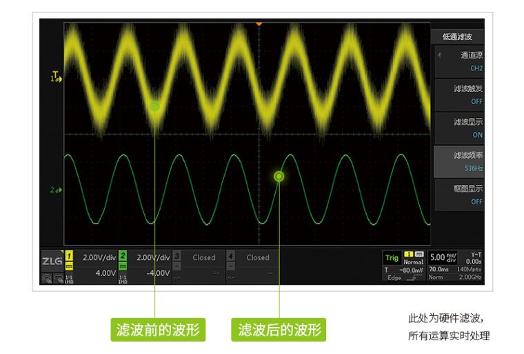 ZDS5000示波器内置FIR硬件实时滤波器,可在10Hz-200MHz范围内任意调节示波器带宽,精准过滤特定频点的噪声与干扰信号,只呈现有效信号。