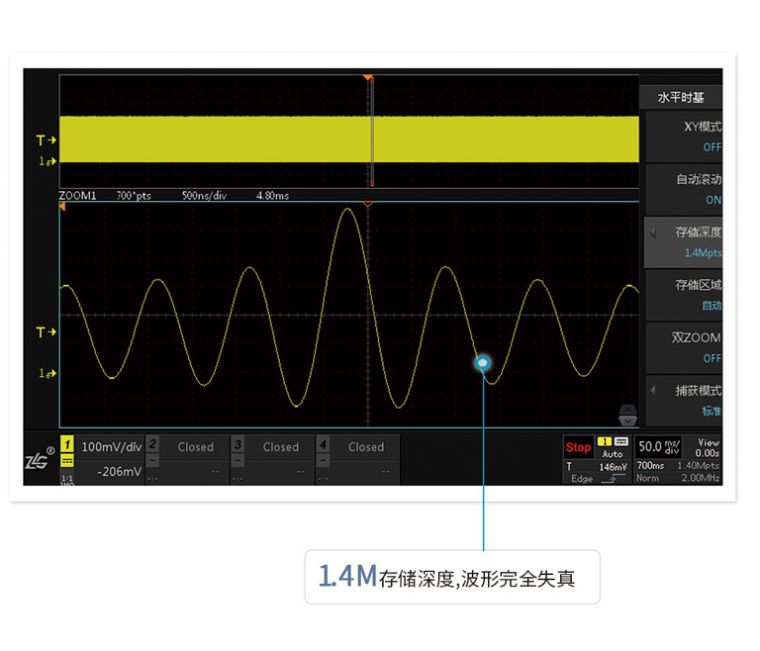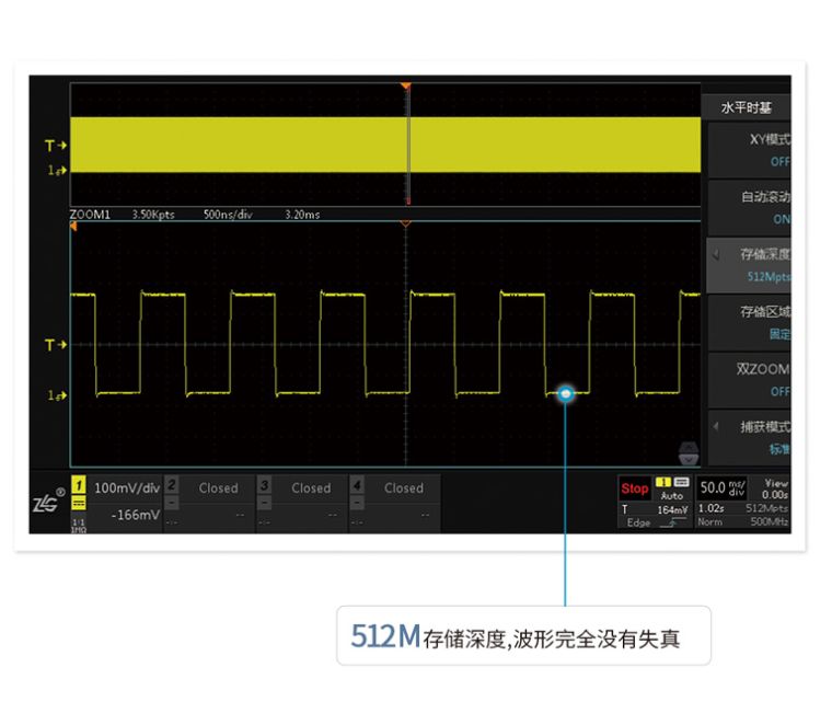 存储深度等于采样率乘以采样时间,512M大存储深度,长时间捕获波形,依然不会出现波形失真。