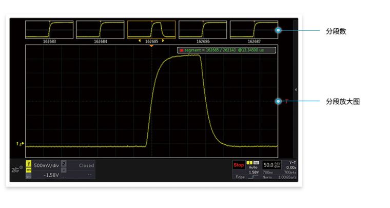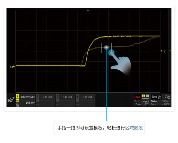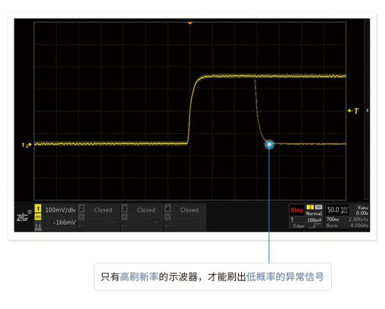 波形刷新率越高,死区时间就越短。ZDS4000系列示波器,标配1M次波形刷新率,配合模板触发,让您最大概率的发现并捕获异常信号。