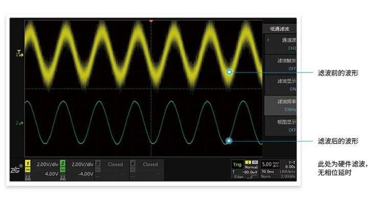 ![]() ZDS4000系列示波器每个通道都内置有从50Hz到200MHz范围的滤波器,特别适用于过滤掉无用信号、观察特定带宽信号的场合,而且支持对滤波之后的波形进行触发和测量分析。 |