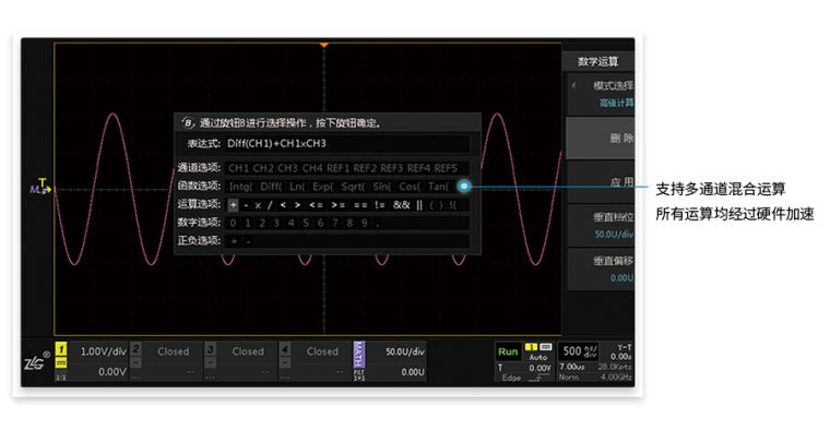 ![]() ZDS4000系列示波器支持波形通道之间的自定义运算功能,并不只是简单的通道间加减乘除,而是自定义波形表达式进行运算。假设1通道输入了电压波形,2通道输入了电流波形,那么只需要设置表达式为Intg(CH1*CH2)就可以直接得到能量曲线。所有运算都基于FPGA全硬件加速,运算波形在几百毫秒之内即可呈现。 |