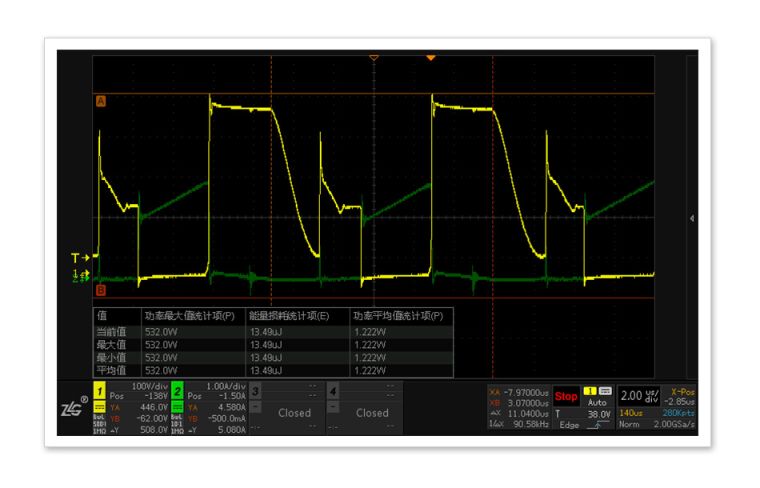 PFC MOS管开关损耗测试是电源调试中的难点,由于不同周期的电压和电流波形都不相同,功率损耗的准确评估也更依赖长时间高采样率的波形捕获,因此存储深度和功率损耗运算原始点数成为开关损耗准确与否的关键。ZDS3024示波器标配250M存储深度,并通过全硬件加速处理优化,可精准量化开关器件的功率损耗。