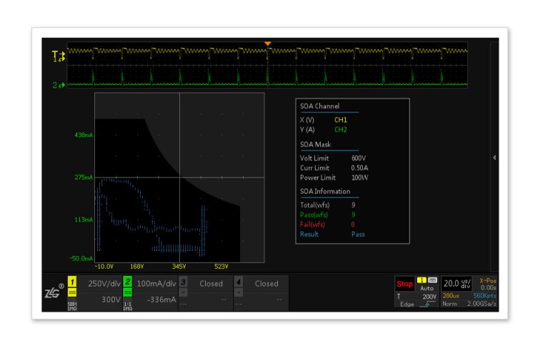 开关器件长期承受较大功耗,一但过压或过流就可能会导致器件损坏甚至爆炸。虽然器件手册中明确标注了IDM和VDS各项参数,但常规调试手段无法对器件的整个工作周期进行评估。通过ZDS3024定制的SOA安全工作区测量功能,可以准确评估整个工作周期内开关器件的所有状态,明确给出电源超出安全工作区的异常概率,便于工程师更好的评估电源工作稳定性。