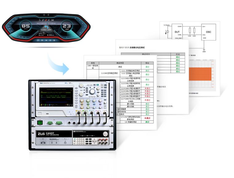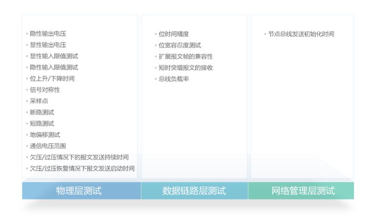CAN一致性测试系统以ISO11898标准为核心,围绕国内主流新能源主机厂CAN总线测试标准为主要依据,测试功能满足物理层、链路层、应用层的测试需求。