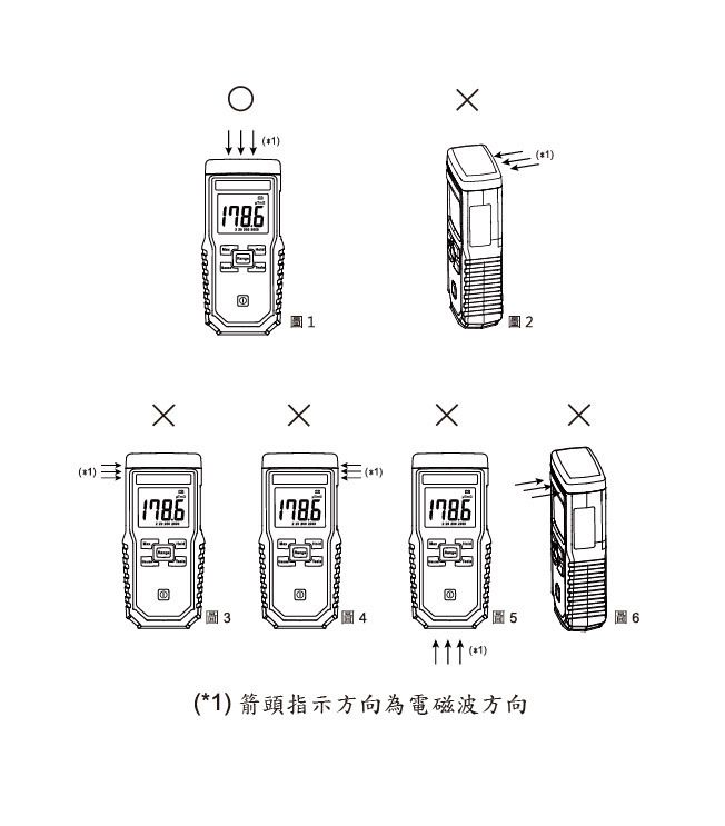 图1为正确测量电磁波的方向。图2、图3、图 4、图 5及图 6为错误的电池波测量方向。