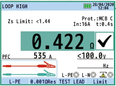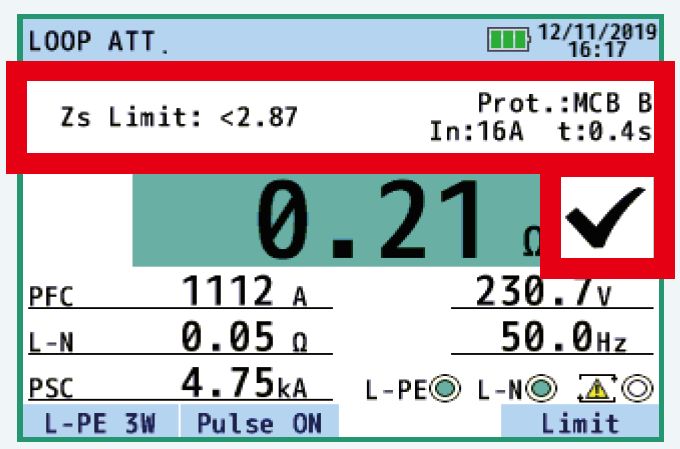 该功能将自动检查TN(或TT接地回路)的测量回路阻抗是否足够低,足以使MCB/保险丝/RCD跳闸(断开),并在显示屏上给出通过或失败的结果.