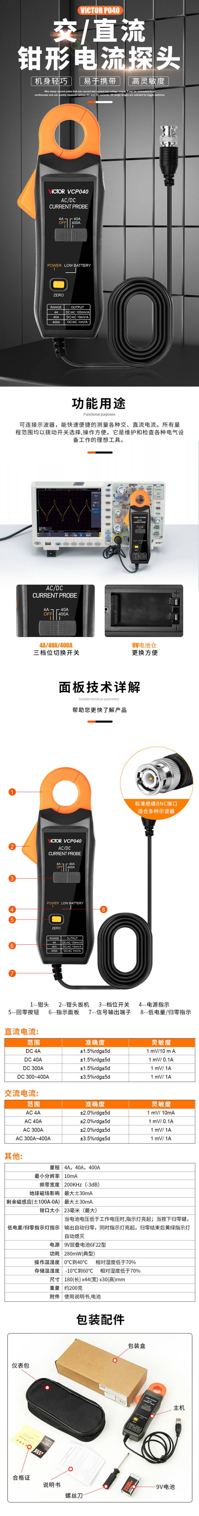VICTOR VCP040是一款迷你示波器钳形电流探头,它能将测试电流转化成电压输出。可连接示波器,能快速便捷的测量各种交、直流电流。所有量程范围均以拨动开关选择,操作方便。它是维护和检查各种电气设备工作的理想工具。