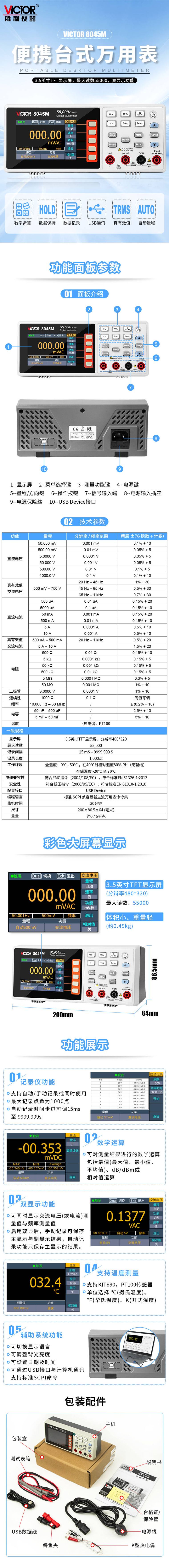 VICTOR 8045M是一款便携式四位半台式数字万用表,搭配3.5英寸高分辨率TFT液晶显示,最大读数55000,直流电压准确度达0.05%,集交直流电压、交直流电流、电阻、电容、通断测试、二极管测试、温度测量、交流+频率测量、最大值/最小值/平均值、相对值测量等众多测量功能于一身,配合记录功能,可长时间监控及分析被测物数据的变化情况,还可以通过USB接口与计算机通讯以实现远程控制。