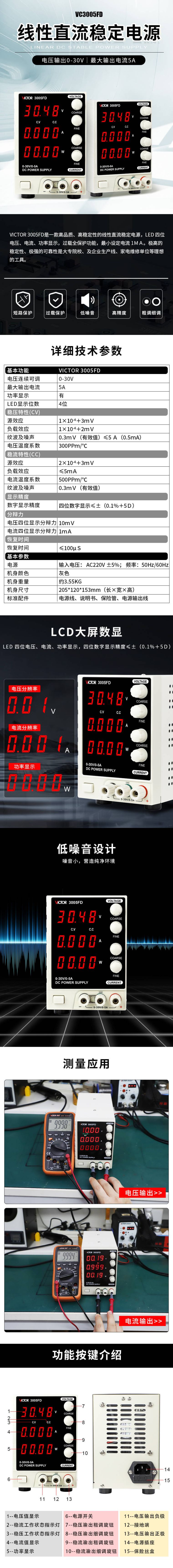 VICTOR 3005FD是一款高品质、高稳定性的线性直流稳定电源,LED 四位电压、电流、功率显示,过载全保护功能,最小设定电流 1mA。极高的稳定性、极强的可靠性是大专院校、及企业生产线、家电维修单位等理想的工具。