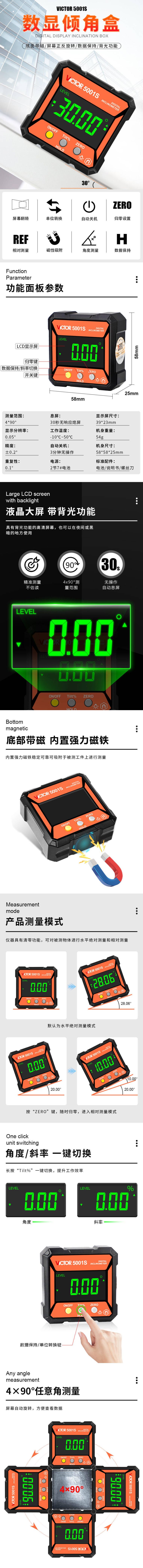 VICTOR 5001S是一款经济型的数显倾角盒,全塑料机身,体积小,重量轻,方便携带和使用。4×90°任意角度测量,搭载带背光的反显屏幕,读数清晰,且当倾角盒倒置时液晶显示的角度读数会自动翻转朝上便于阅读。集斜度/角度测量功能和相对/**测量模式等优点于一体,能轻松应对其广泛的应用领域。