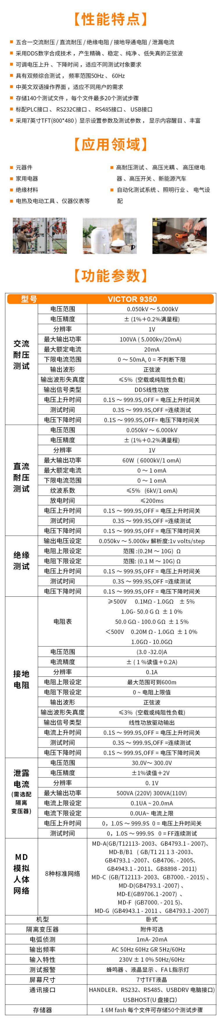 VICTOR 9350具有交流耐压 / 直流耐压 / 绝缘电阻 / 接地导通电阻 / 泄漏电流测试功能,是一款五合一多功能的安规综合测试仪 ,一站多任务解决所有安全顾虑,是系统整合 、实验研发的优先解决方案 。一台机满足所有安规测试 。