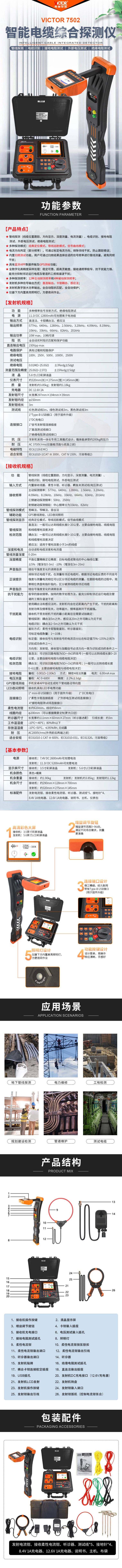 VICTOR 7502智能电缆综合探测仪是一款综合性能很强的路径探测仪器。具有管线路径探测、电缆识别、接地电阻测试、绝缘电阻测试等多种功能。仪器由发射机、发射电流钳、接收机、接收柔性电流钳、连接测试线、听诊器等组成。能在非开挖的情况下,用于金属管线、地下电缆的路径探测、管线普查和深度测量,使用多种滤波技术,具有一定抗干扰能力,能精准定位和测深。